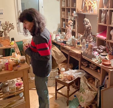 Gwen Le Gars est née en 1958 à Quimper, elle vit entre Paris et le Finistère, en Bretagne. Elle sculpte la terre depuis plus de trente ans. Son monde s’y enracine : arbres de cocagne aux ramures rondes, paysages de falaises, volcans éteints à la texture bleutée ou souches enflammées de pigments ocres et jaunes. Une statuaire qui renvoie à une nature vierge, intacte, primitive, ou érodée par le temps.